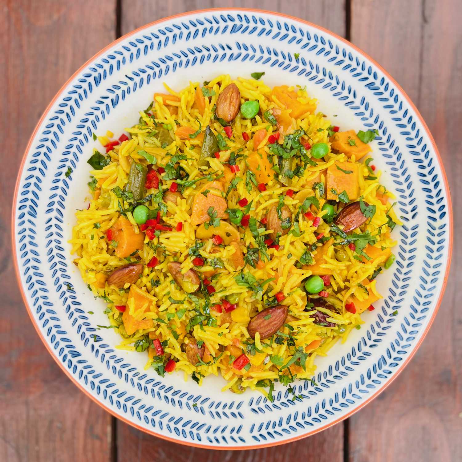 This veggie pulao isn’t traditional, thanks to the sweet potato, but it’s colourful, hearty, and packed with nutrients. The mix of vibrant vegetables and crunchy nuts makes each bite satisfying and full of texture, while the spices tie it all together. It’s a wholesome, feel-good dish that’s as beautiful as it is delicious — perfect for a nourishing vegetarian or vegan meal.